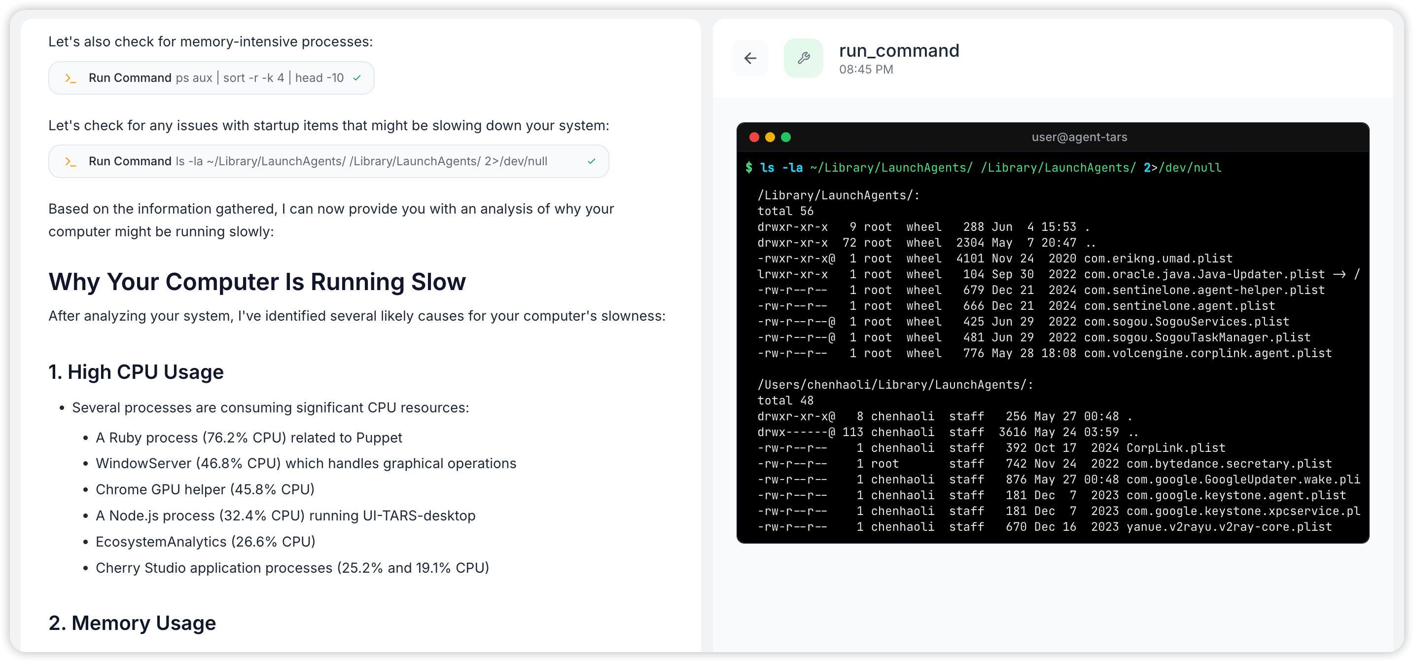 Sometimes, your computer might suddenly become laggy. You can ask Agent TARS to help you analyze why your computer is slow: